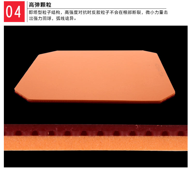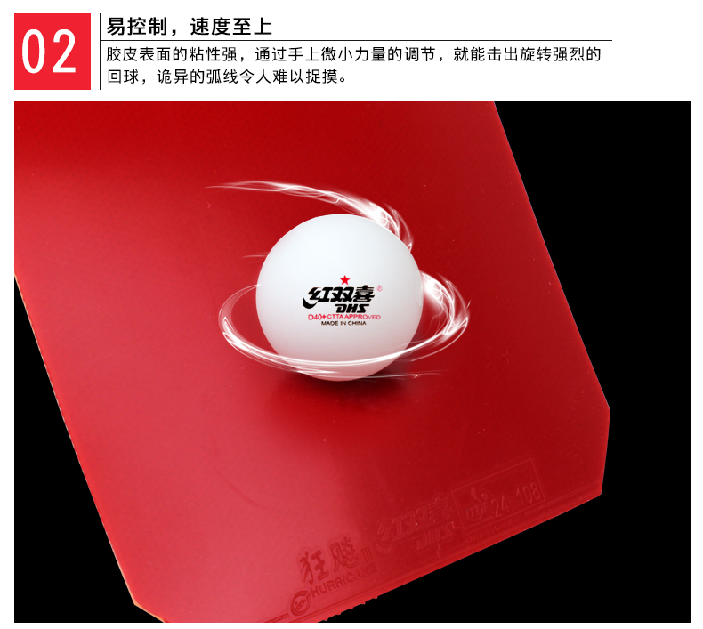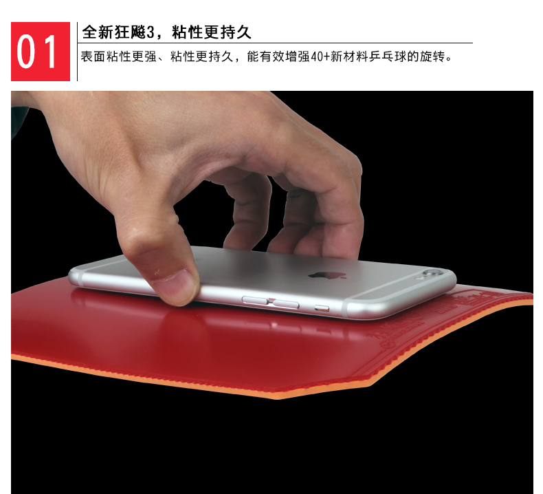 特點(diǎn): “狂飚Ⅲ”在解決40毫米大球所產(chǎn)生的技術(shù)影響的同時(shí),特別針對以控制球?yàn)橹骰虬l(fā)力相對較小的運(yùn)動(dòng)員而研制??蓽p少發(fā)力時(shí)的沉重感,并獲得較長的弧線,有利于對球的控制,在近臺即能發(fā)揮快攻和弧圈威力。