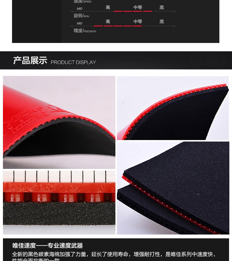 加大的臺(tái)前安全進(jìn)攻區(qū)域,更高的命中率,全新的黑色碳素海綿兩倍加強(qiáng)力量,延長(zhǎng)使用壽命,增強(qiáng)耐打力。