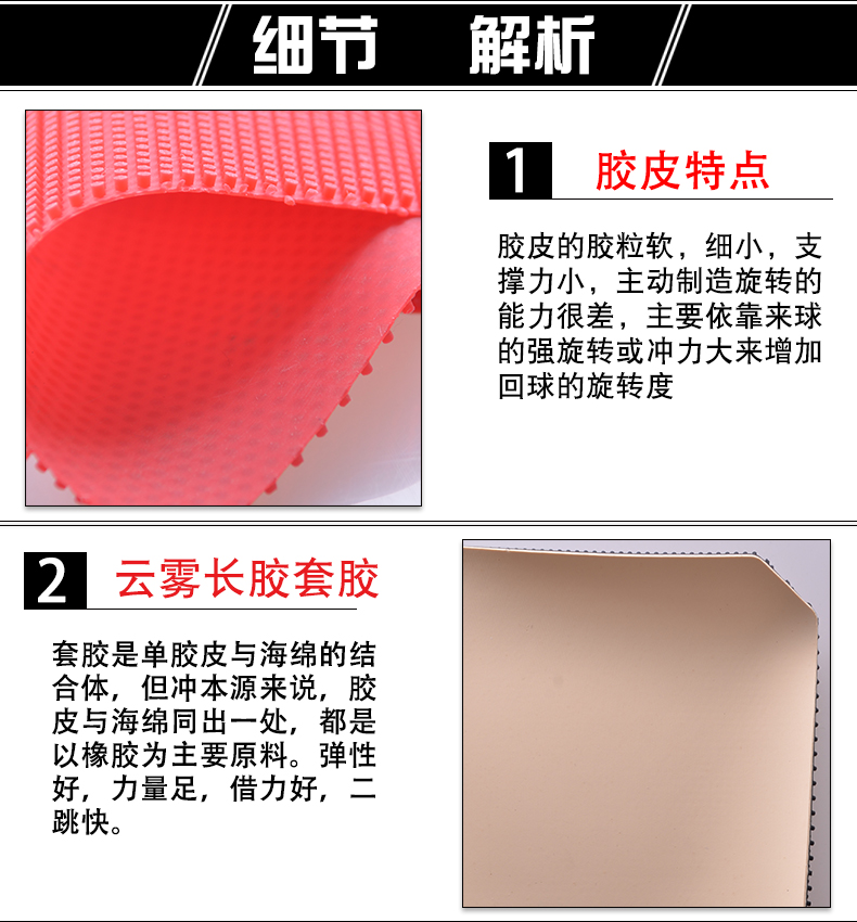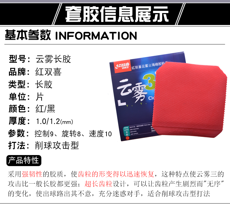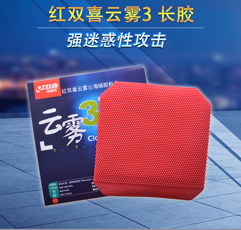 采用強(qiáng)韌性的膠質(zhì),使齒粒的形變得以迅速恢復(fù),這中特點(diǎn)使云霧三的攻擊力比一般長膠都更強(qiáng);超長齒粒設(shè)計(jì),可以讓齒粒產(chǎn)生劇烈而“無序”的變化,使出球線路出其不意,充分迷惑對(duì)手,適合削球攻擊型打法。