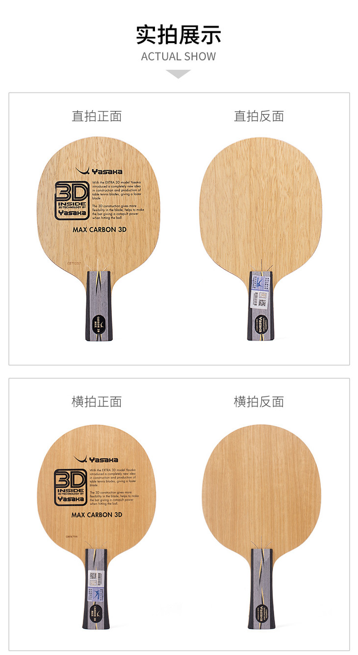 馬碳加強(qiáng)面材和老款馬林碳相似,較軟,吃球深,控制性不錯(cuò);但碳層和力材堅(jiān)挺,支撐有力,前沖弧圈很爆,破壞力強(qiáng)勁!比馬林碳速度要快。YASAKA的“3D”設(shè)計(jì),蓋亭的心愛武器,3D的設(shè)計(jì)增加了底板的鞭打效應(yīng),使得擊球速度更快。