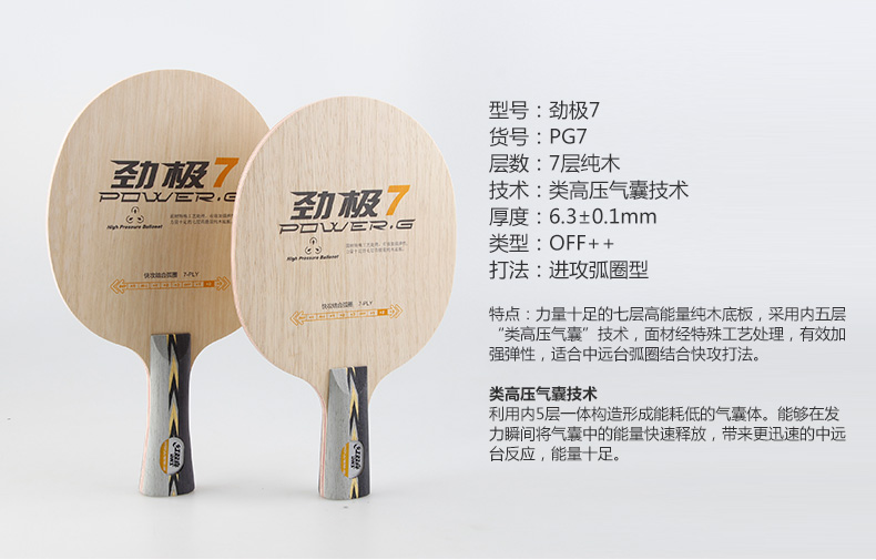 力量十足的七層高能量純木底板,采用內(nèi)五層“類高壓氣囊”技術(shù),面材經(jīng)特殊工藝處理,有效加強彈性,適合快攻結(jié)合弧圈打法。