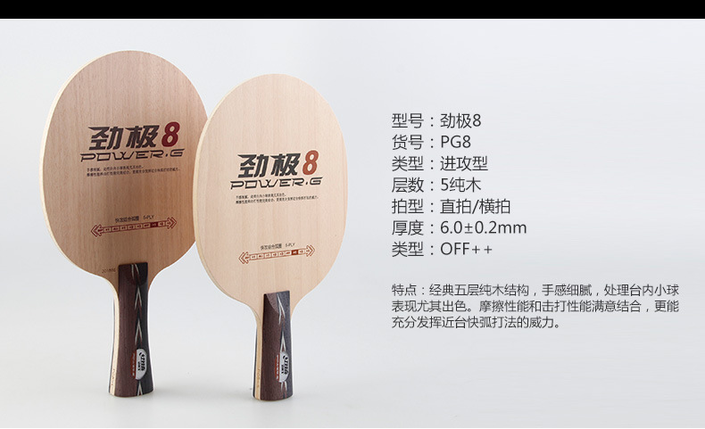經(jīng)典五層純木結(jié)構(gòu),手感細(xì)膩,處理臺(tái)內(nèi)小球表現(xiàn)尤其出色。摩擦性能和擊打性能結(jié)合,更能充分發(fā)揮近臺(tái)快弧打法的威力。