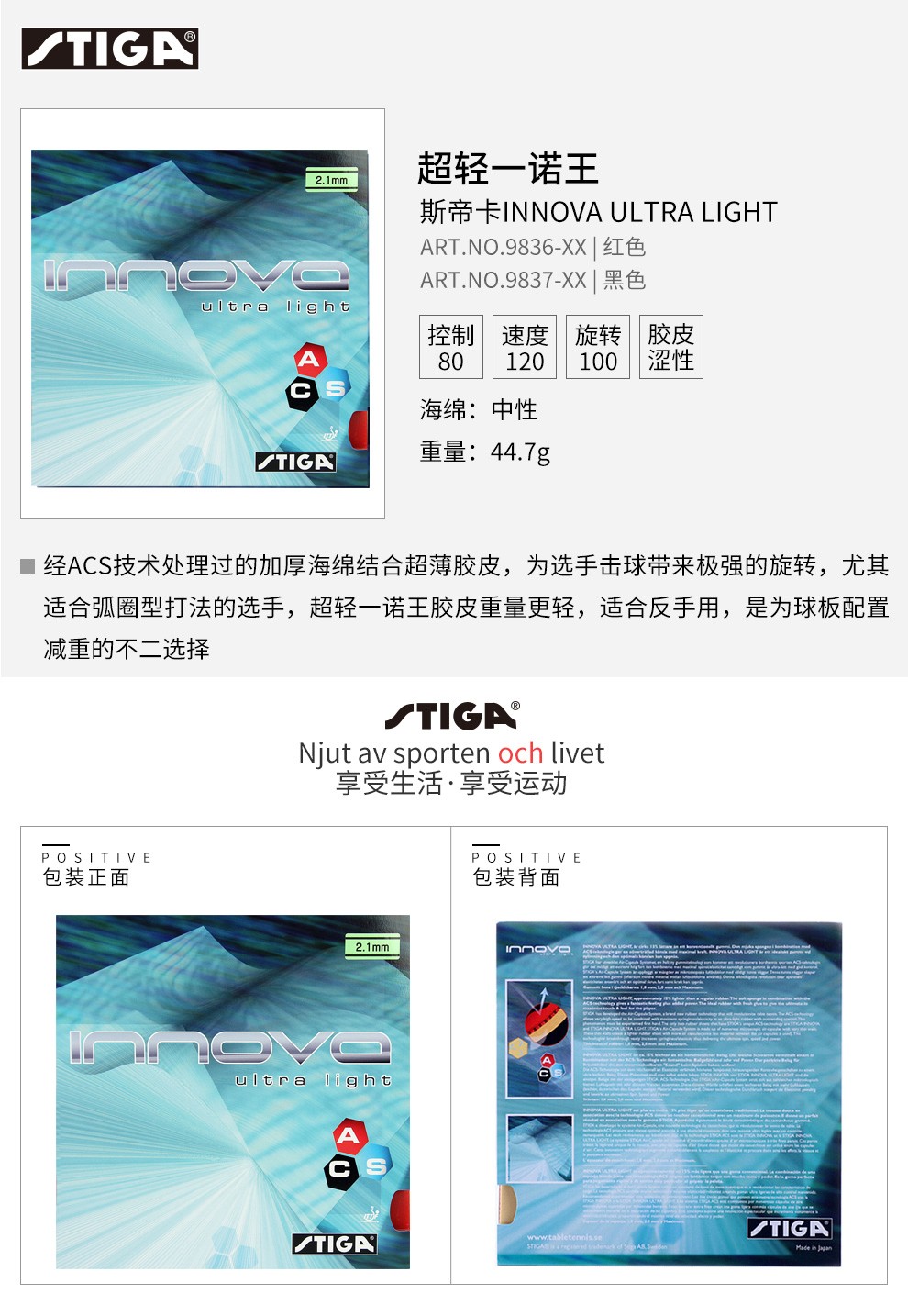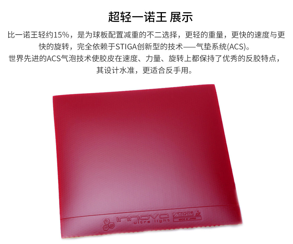 斯帝卡超輕一諾王Innova(Ultra light)比一諾王輕15%,更利于選手對(duì)球的控制,更適合用于反手。
