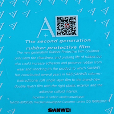 第二代膠皮保護膜它具有保護膠皮清潔延長膠皮壽命的同時還具有增加粘性和防止膠皮受外力損傷的效果,具有防劃、防熱、防紫外線照射、防起鱗的功能。它是北京三維體育用品有限公司經(jīng)過多年研發(fā)的產(chǎn)品;它改變了傳統(tǒng)的單層軟塑料膜作為膠皮保護膜的方式,運用了尖端科技制成外層硬質(zhì)塑料片和內(nèi)層粘性膠質(zhì)的雙層膠皮保護膜。
