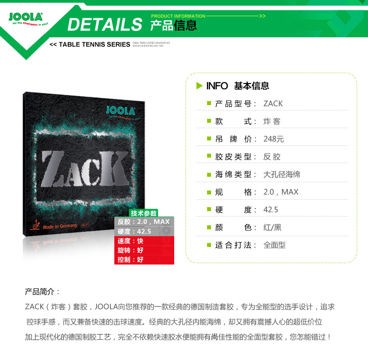 - 商品名稱:優(yōu)拉JOOLA ZACK炸客套膠