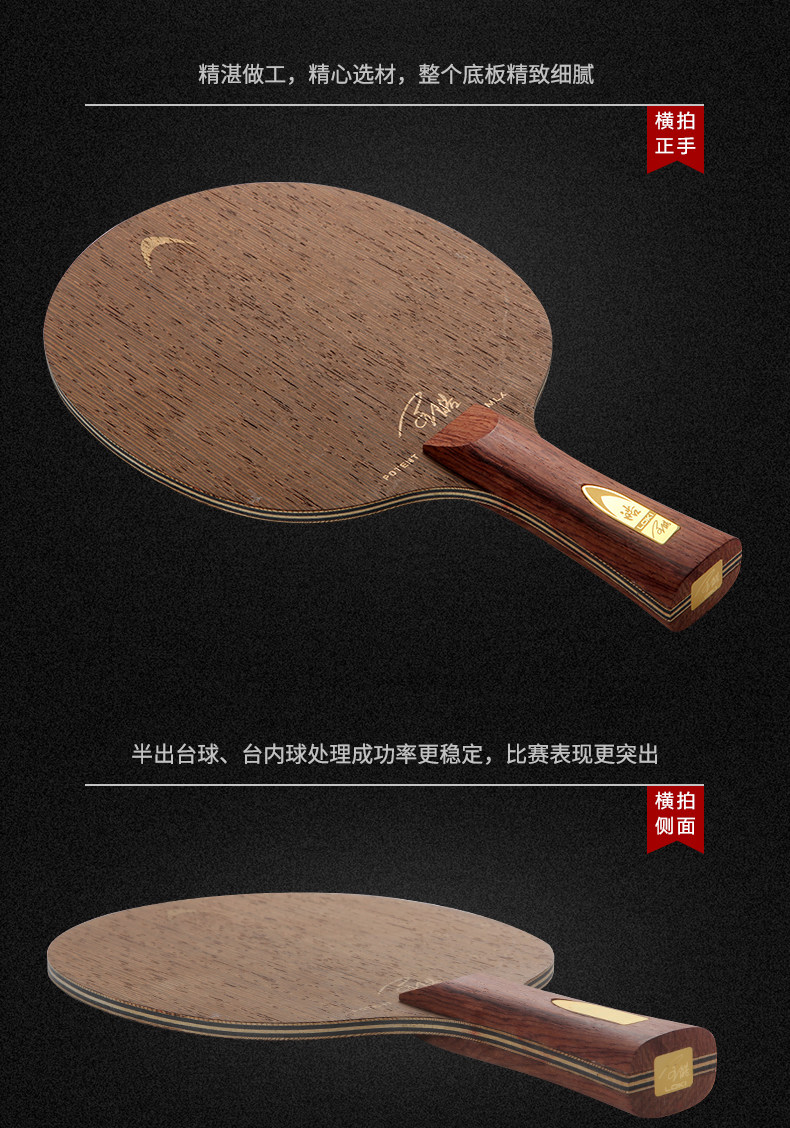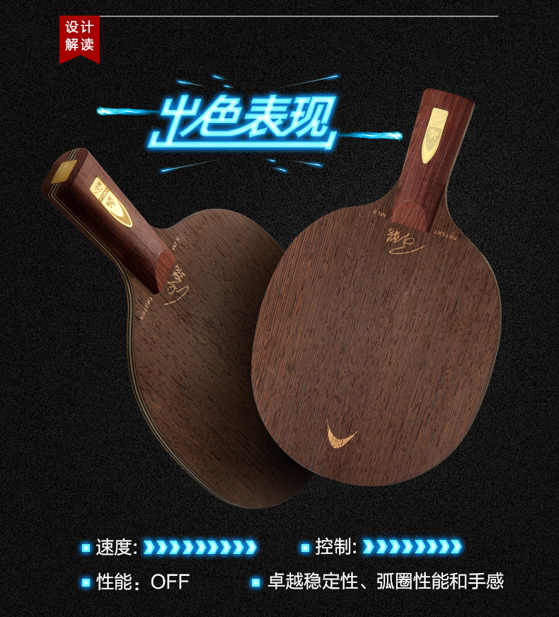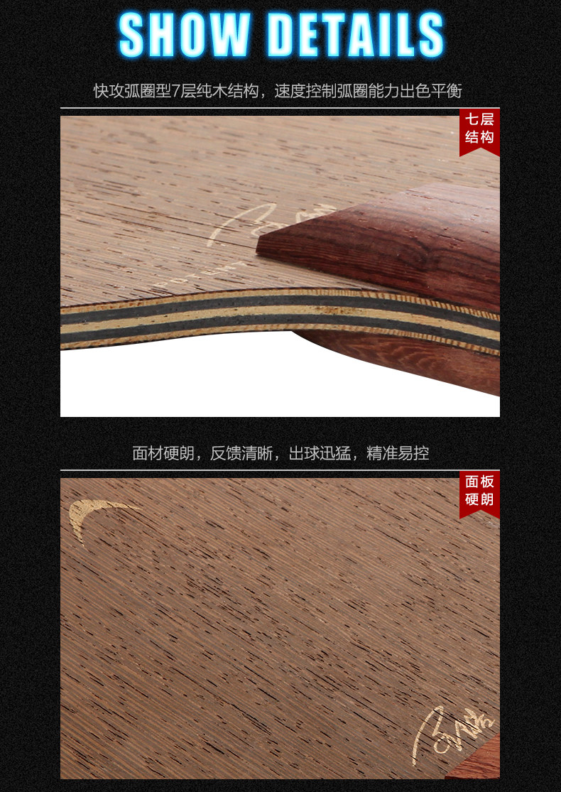 快攻弧圈型七層純木結(jié)構(gòu),速度??刂?、弧圈能力出色的平衡,優(yōu)雅的黑檀實木手柄,舒適的握感與重心。