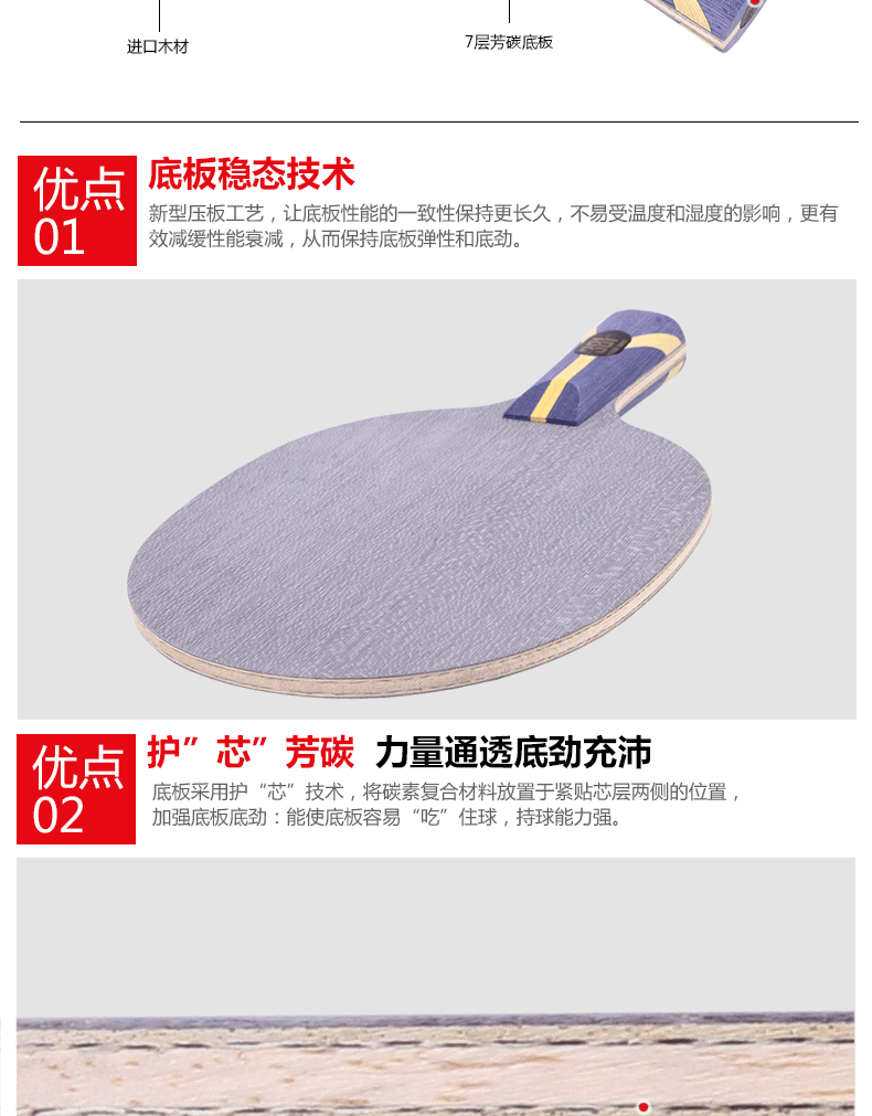 簡介:新型壓板工藝,讓底板一致性保持更長久,不易受溫度和濕度的影響,能有效減緩性能衰退,從而保證底板的彈性和底勁。采用BBT技術(shù)的301底板在國乒選手中也大受歡迎。