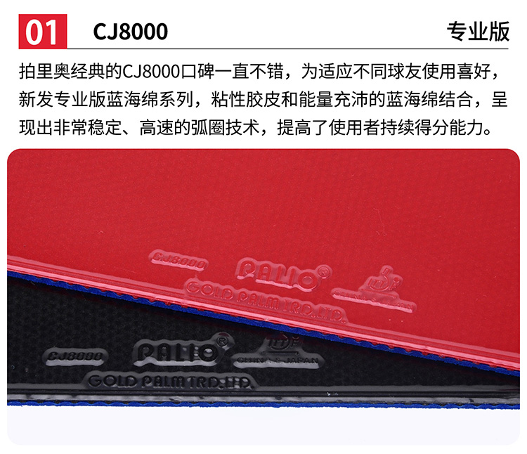 簡介:CJ8000系列套膠作為拍里奧品牌經(jīng)典產(chǎn)品,為適應(yīng)不同球友使用喜好,新研發(fā)專業(yè)版藍(lán)海綿系列,粘性膠皮和能量充沛的藍(lán)海綿結(jié)合,呈現(xiàn)出非常穩(wěn)定、高速的弧圈技術(shù),提高了使用者持續(xù)得分能力。藍(lán)色海綿版本通過特殊工藝,使海綿彈性更好,吃球更深;技術(shù)的優(yōu)化,使其對膠水的依賴性得以降低,不灌膠也可發(fā)揮套膠的特性,刷膠或者刷油后效果更勝一籌。