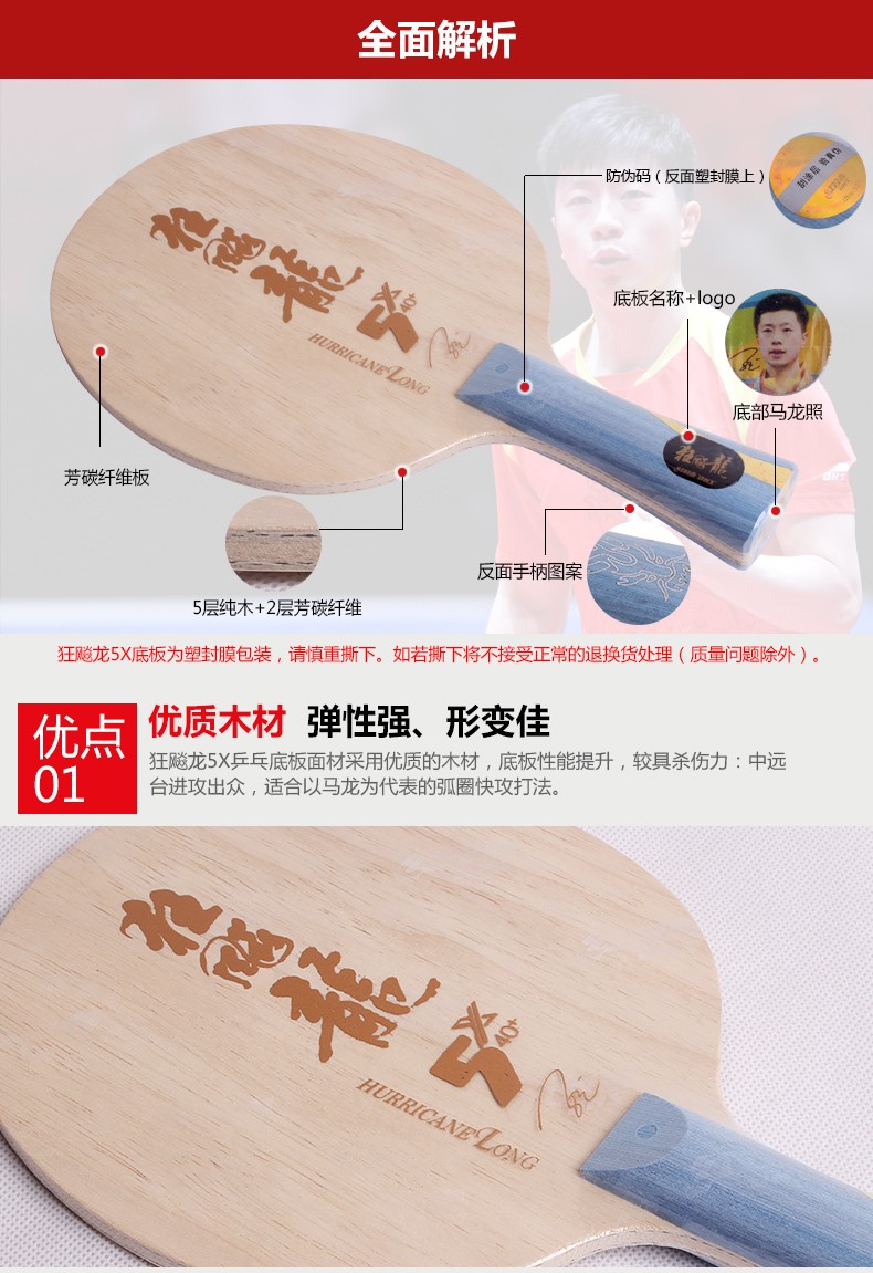 簡介:龍五X,在原有型號的基礎(chǔ)上對解耦股進行了優(yōu)化微調(diào),降低力材厚度的同時加厚了芯材厚度,讓底板觸球瞬間反饋更靈敏,七層芳碳纖維板,應(yīng)用“護芯”技術(shù),更底勁內(nèi)蘊,一觸即發(fā);發(fā)力通透酣暢,小球清晰穩(wěn)定。延續(xù)馬龍系列攻防轉(zhuǎn)換快,快速而多變的風(fēng)格。帶給你大滿貫的手感!