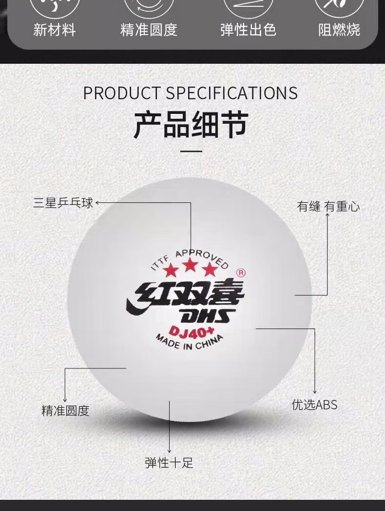 • 商品名稱:紅雙喜DHS DJ40+新材料乒乓球 WTT系列賽事用球 大賽球 白色6個裝